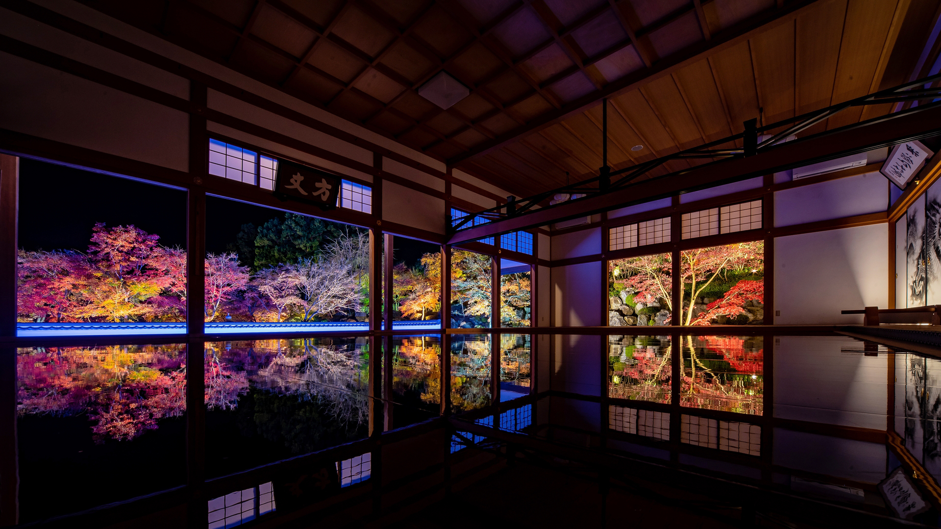 本堂の床に季節の景色が反射する幻想的な光景です。特に秋の紅葉シーズンは人気が高く、もみじがとてもキレイです!ライトアップも行われています!